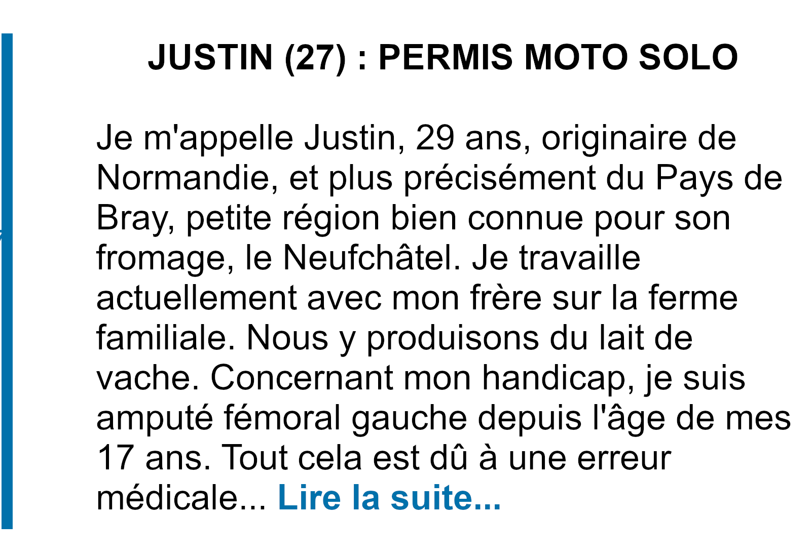 Je suis motard depuis mes 10ans. Suite à un accident de moto en 2016, j'ai perdu l'usage de mon bras gauche du coude aux doigts, à cause de lésions au plexus brachial et racines nerveuses dans la colonne vertébrale. J'ai longtemps pensé, à tort, que mon handicap allait me contraindre à oublier cette passion. Suite à des recherches sur internet, je suis arrivé jusqu'au site d'HMS, qui m'a prouvé que la moto était possible avec un handicap.