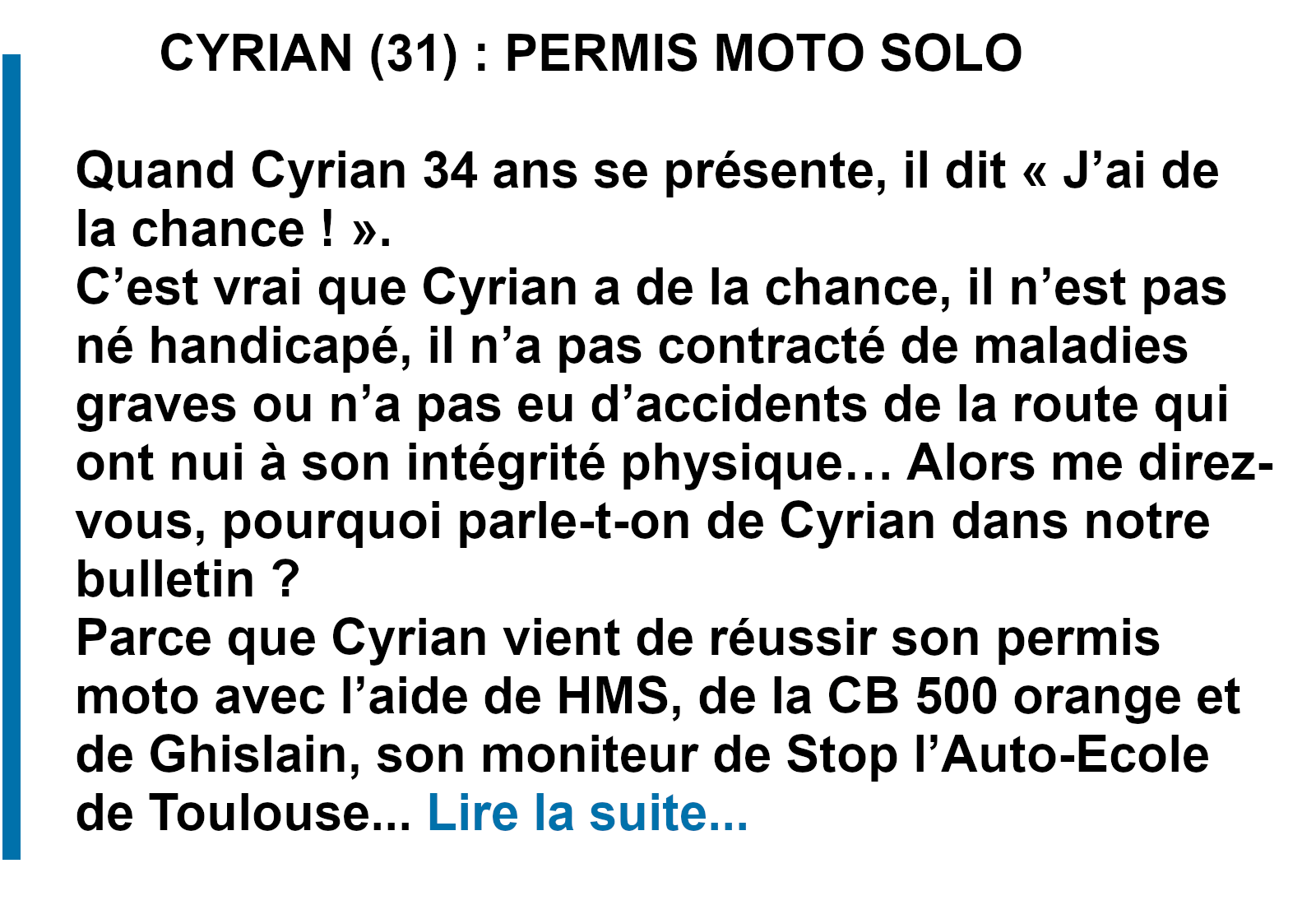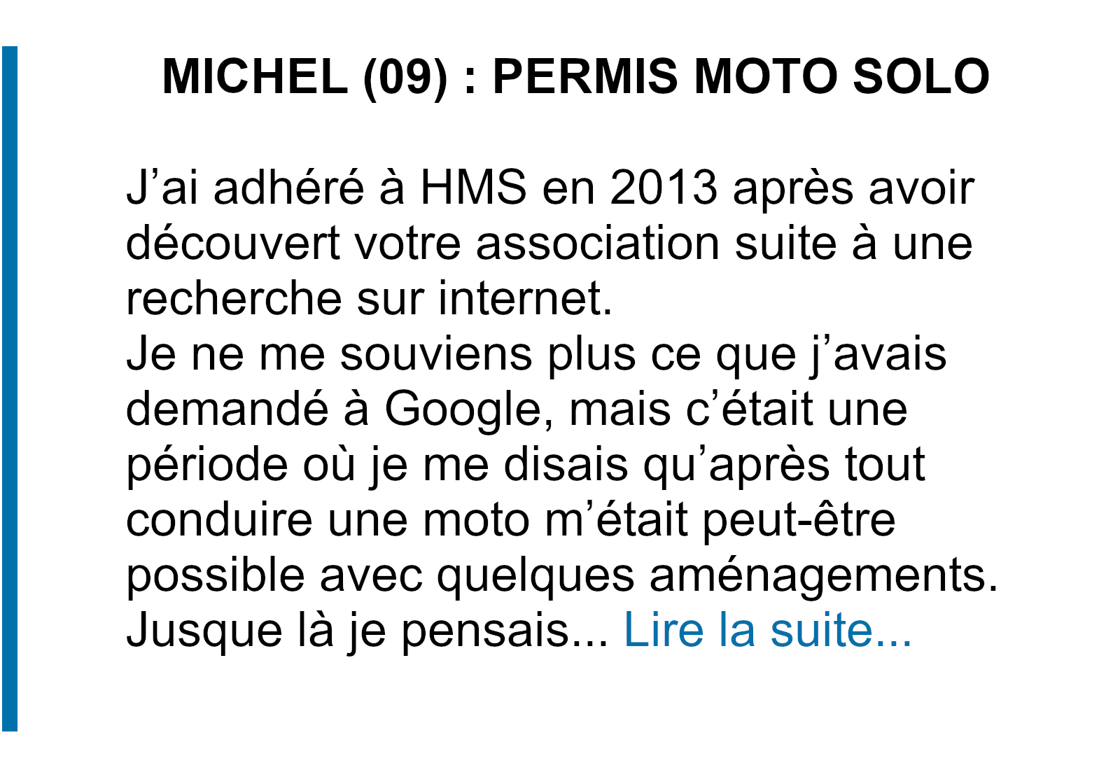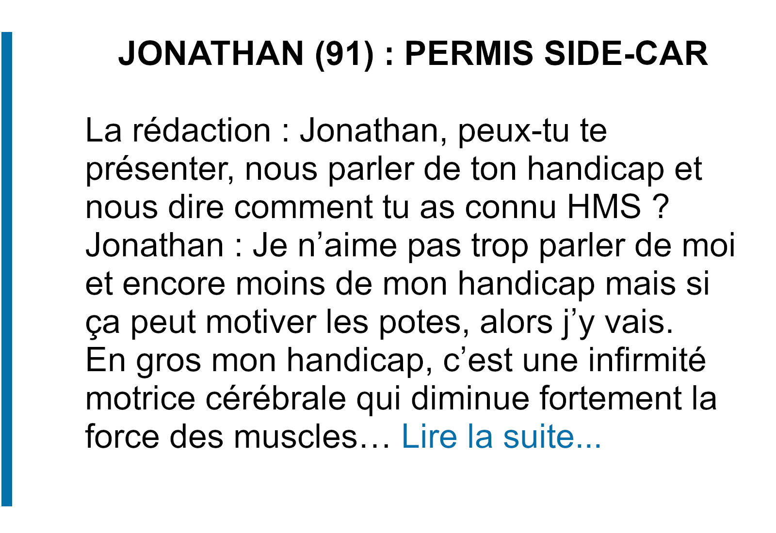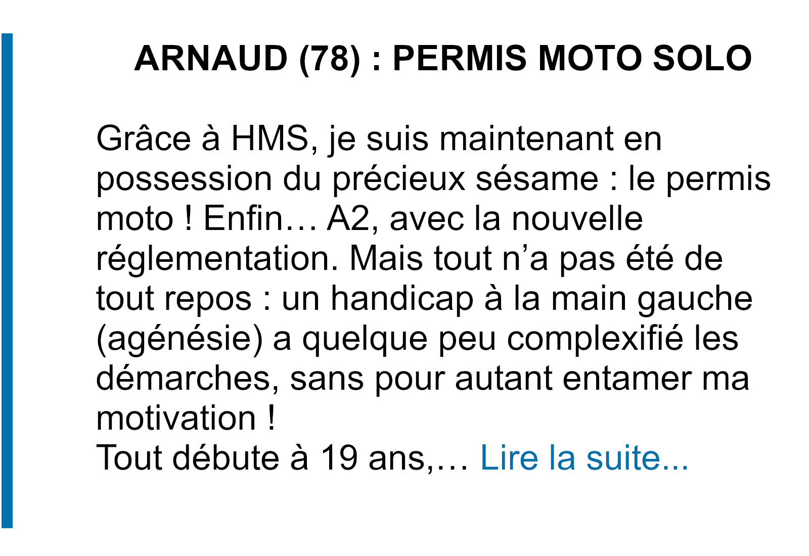 Nota 1 : HMS préconise de mettre le frein à l'index gauche, plutôt qu'au pouce, rendant ainsi possible la manipulation des clignotants ou du klaxon lors des phases de freinage, ceci afin de respecter l'article 412.6 du code de la route.
