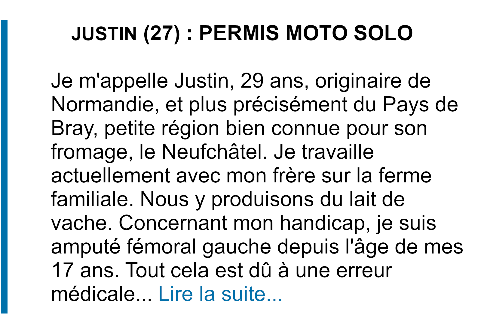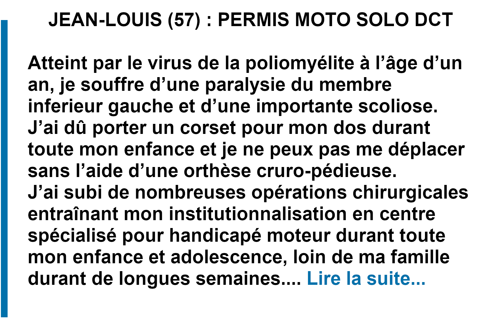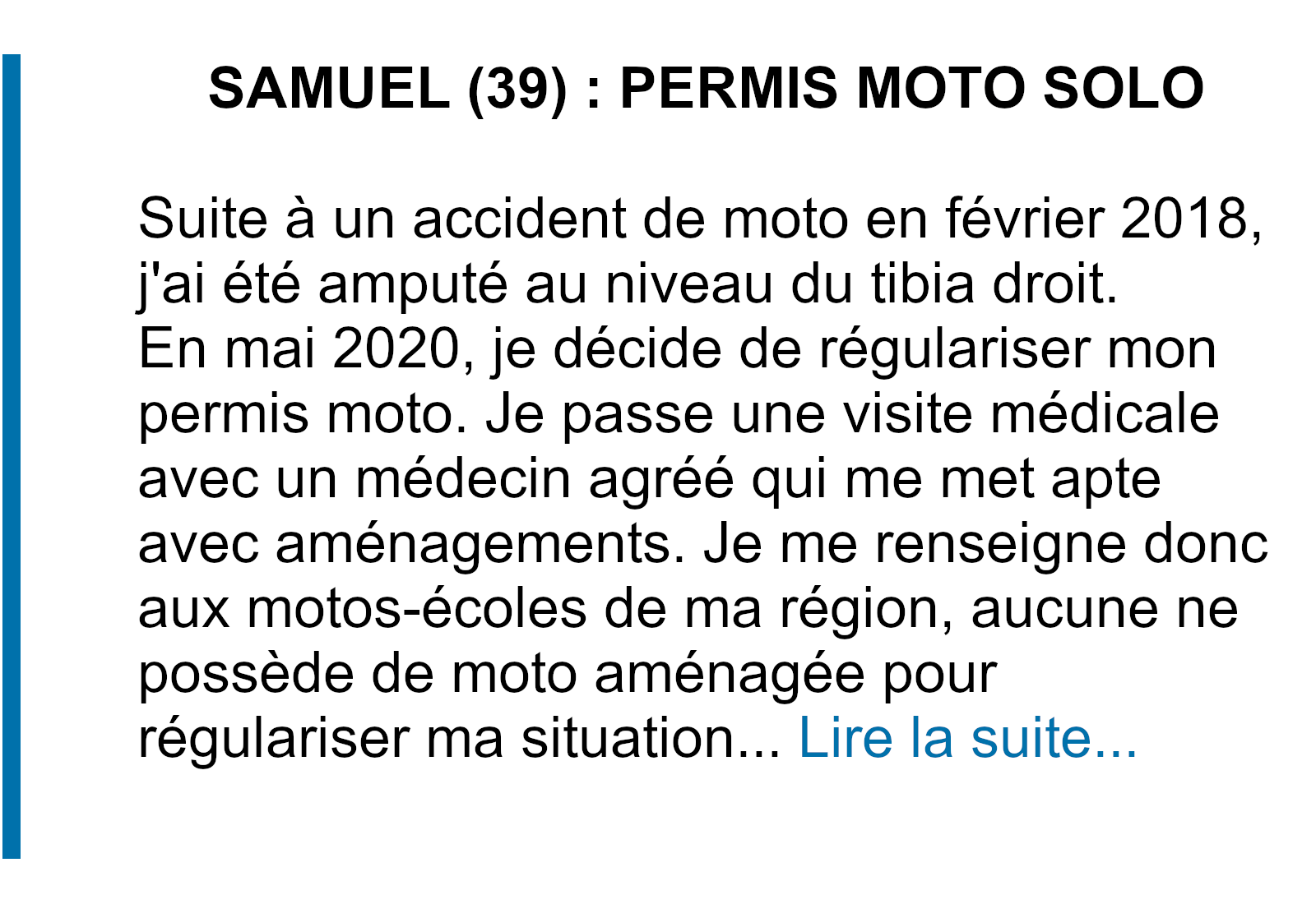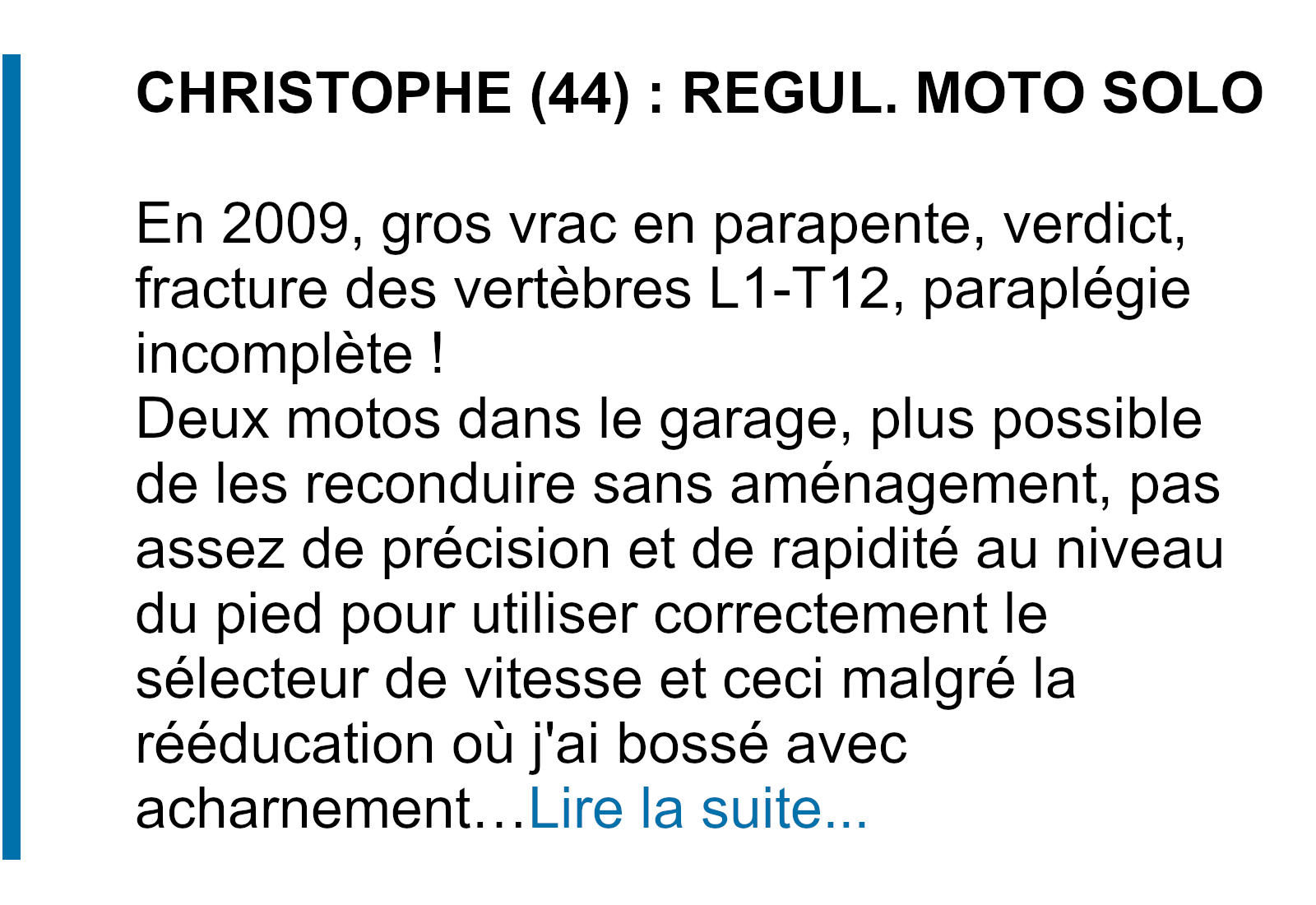 si double amputation tibiale, la moto devra être équipée avec les aménagements jambes droite et gauche (Code restriction permis : 44.03 & 10).